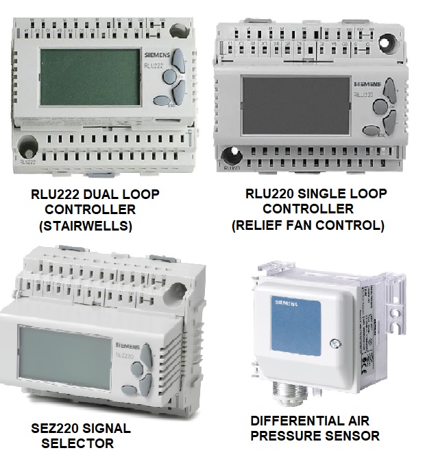 PRE-PROGRAMMED STAIRWELL PRESSURE CONTROL SYSTEM c/w 9 DIFFERENTIAL PRESSURE SENSORS (4 FOR EACH STAIRWELL & 1 FOR RELIEF FAN CONTROL)